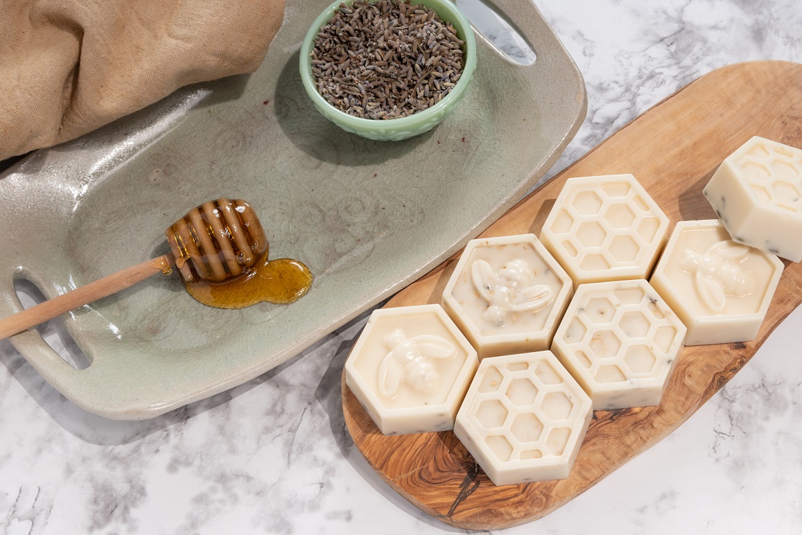 Hand soap with honey, milk and vegetableoils cleans and nurtures the skin.Decorative honeycomb form.Weight: 50g
